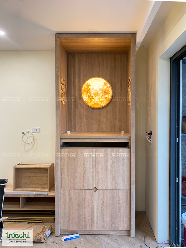 – Không gian thi công: Ban thờ đứng trong phòng khách nhà chung cư